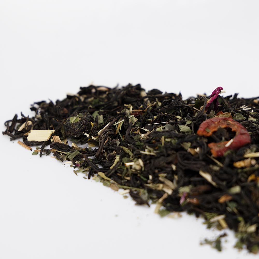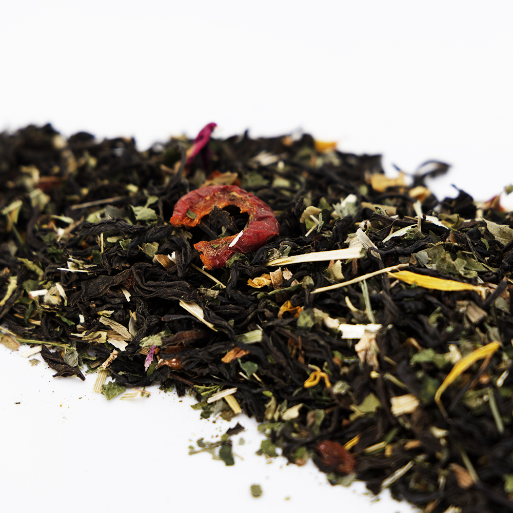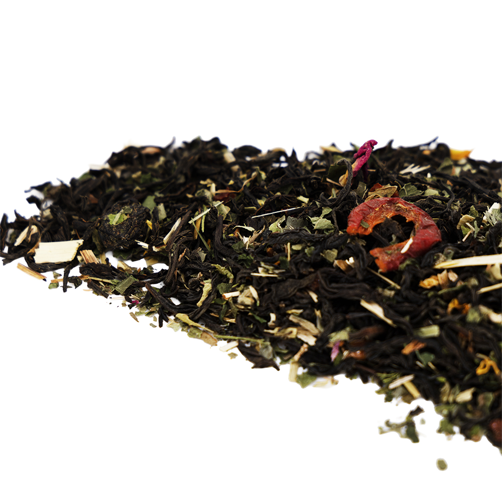 Składniki: herbata czarna Indie OP, owoc róży, owoc tarniny, ziele ostrożenia, ziele owsa, owoc rokitnika, ziele rzepiku, korzeń arcydzięgla, liść pokrzywy, liść jeżyny, różeniec kłącze, płatki róży, kwiat nagietka.