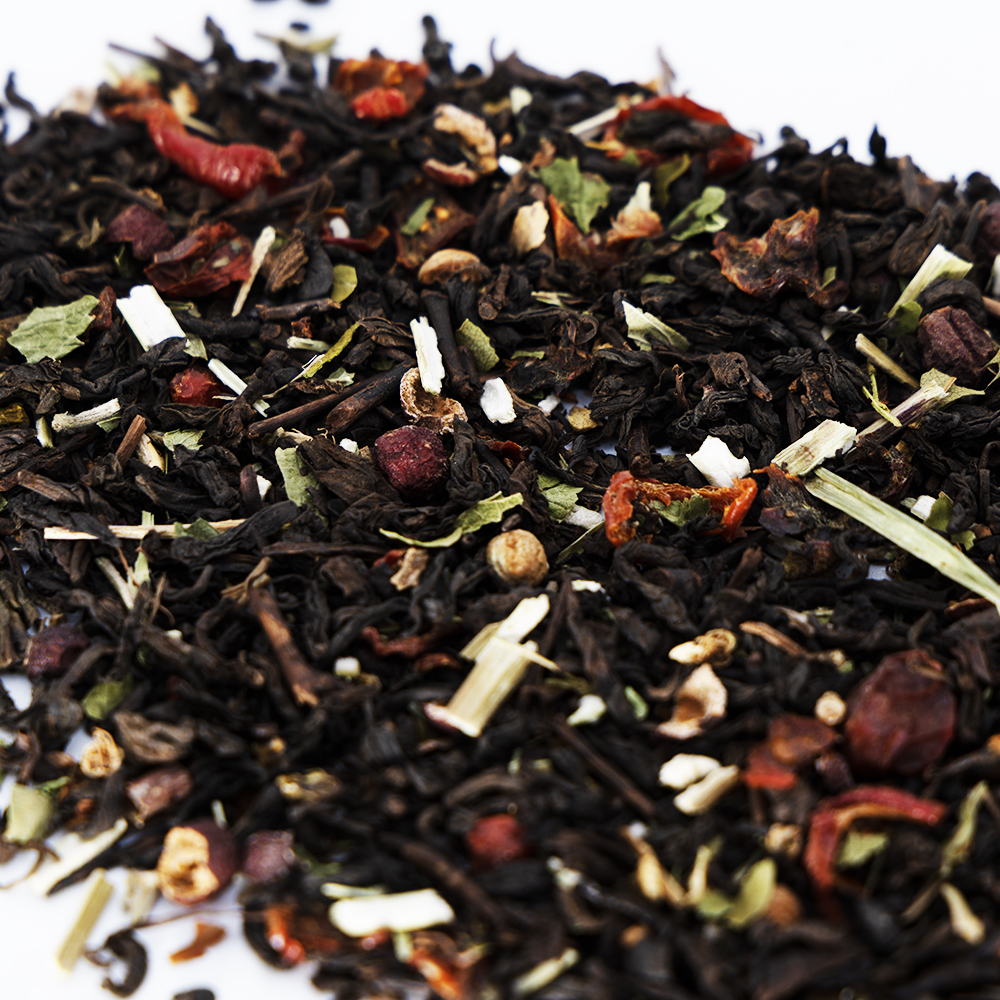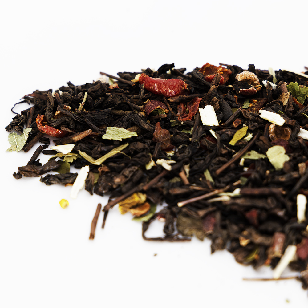 Składniki: herbata czerwona Pu Erh, trawa cytrynowa, owoc głogu, owoc dzikiej róży, ziele serdecznika, kwiat głogu, korzeń kozłka lekarskiego, liść poziomki, ziele jemioły, owoc aronii.