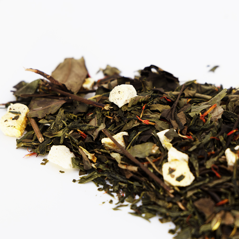 Składniki: herbata zielona Sencha, herbata biała Pai Mu Tan, aromat, brzoskwinia liofilizowana, krokosz, płatki nagietka.