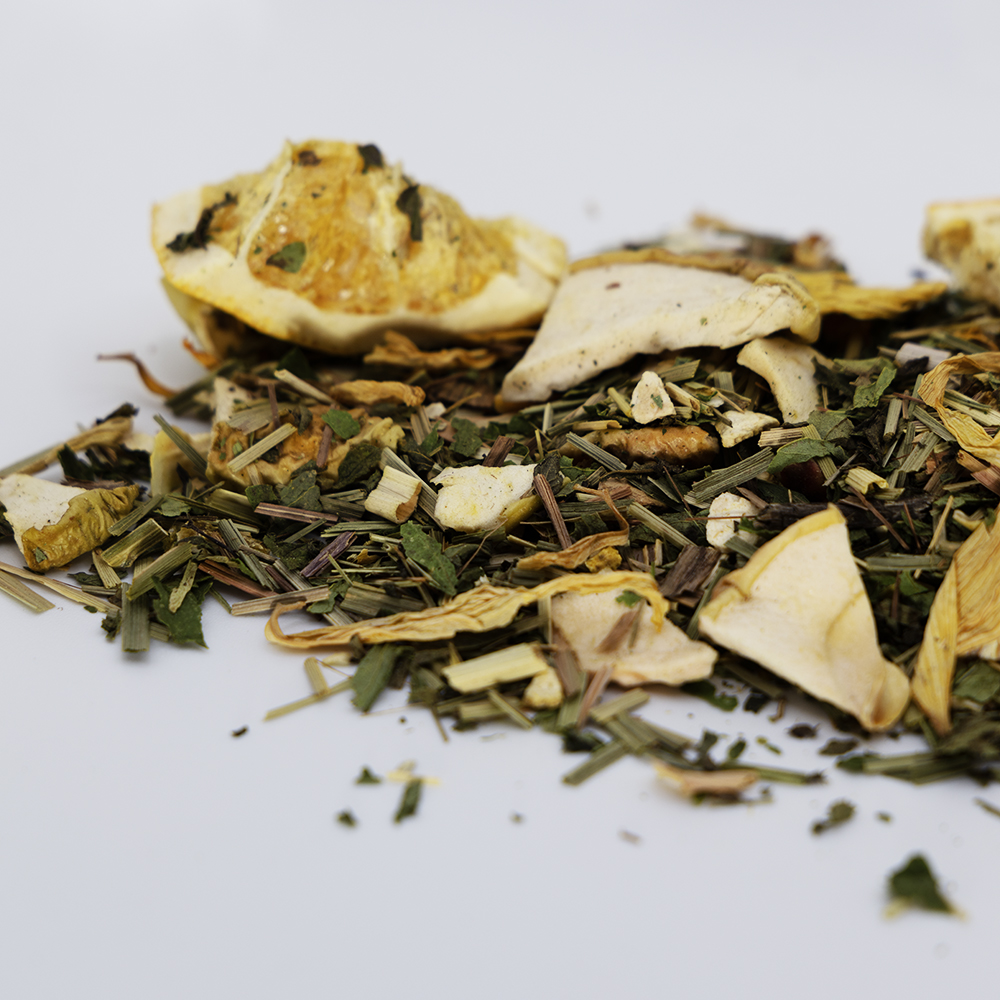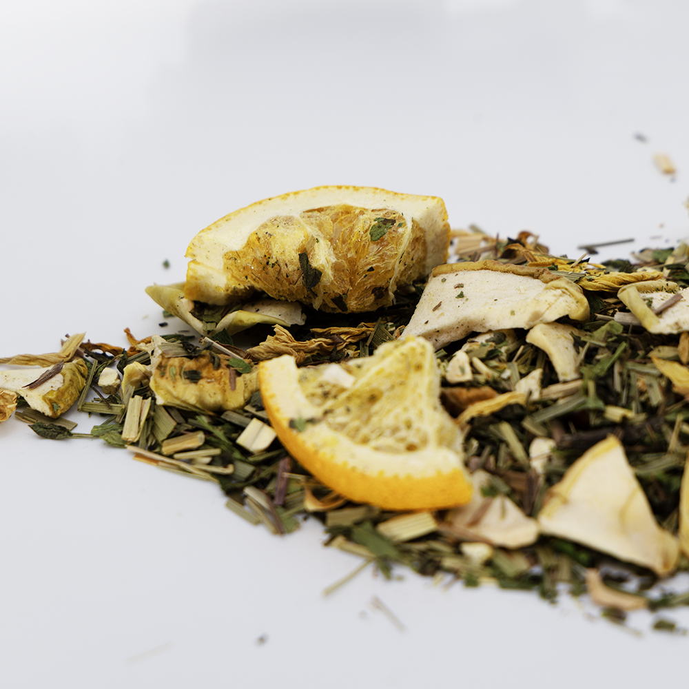 Składniki: jabłko suszone, trawa cytrynowa (26,5%), mięta, skórka cytryny (11%), pomarańcza liofilizowana, naturalny aromat, kwiat słonecznika, substancja konserwująca E223.